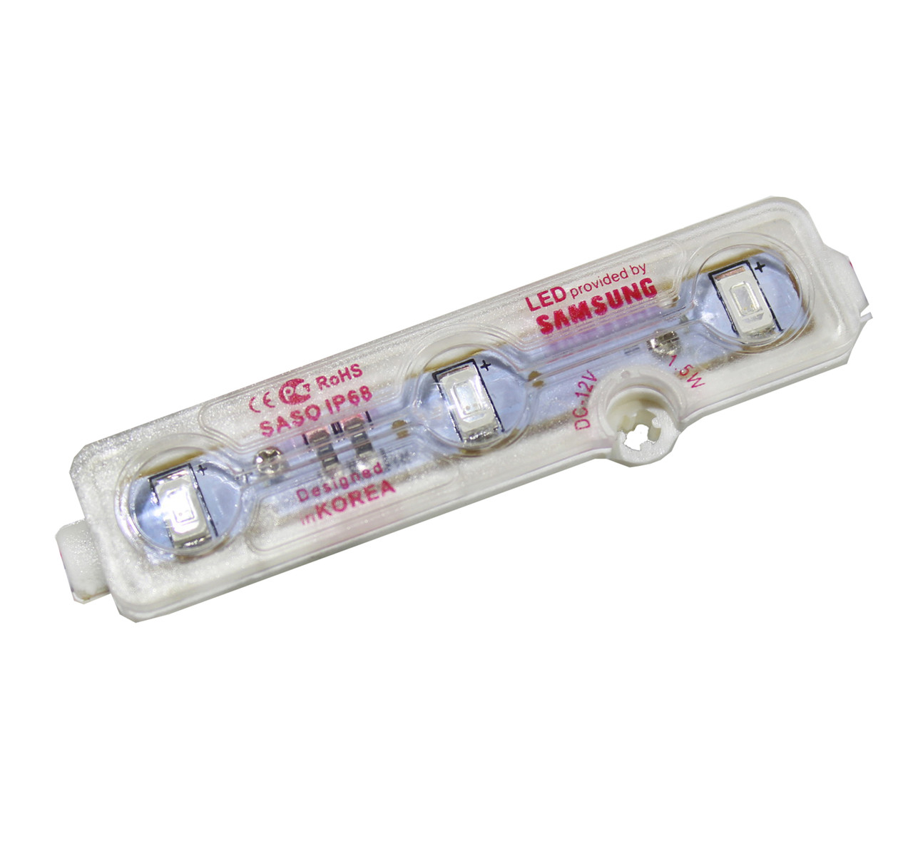 Cветодиодный модуль 5630 SAMSUNG (Red) на 3 диода выполнен из пластика и имеет цвет свечения — красный (Red), потребляемая мощность 1.5 Вт. Крепится модуль на двухсторонний скотч типа 3М или саморезы. Цифра 5630 означает тип используемого диода в модуле.