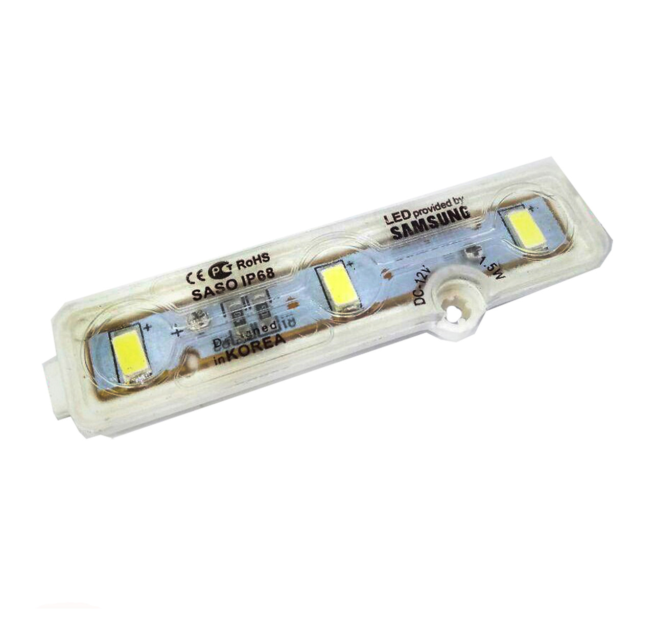 Cветодиодный модуль 5630 SAMSUNG (СW) на 3 диода выполнен из пластика и имеет цвет свечения — холодный белый (Cool White), потребляемая мощность 1.5 Вт. Крепится модуль на двухсторонний скотч типа 3М или саморезы. Цифра 5630 означает тип используемого диода в модуле.