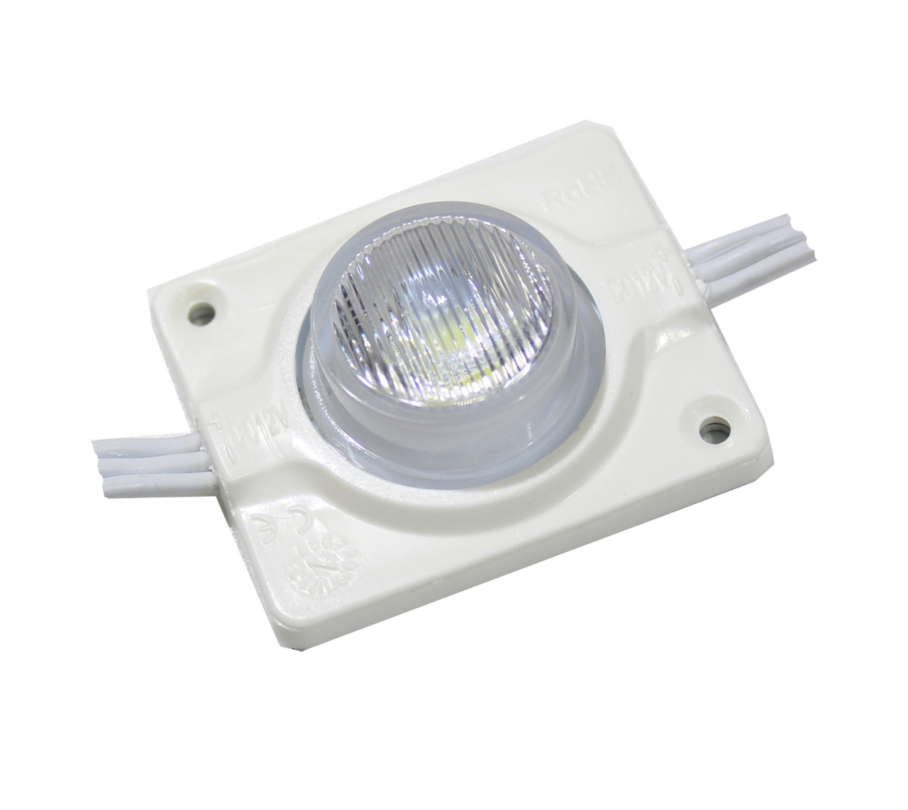 Cветодиодный модуль инжекторный 3535 СW на 1 диод (линза) выполнен из пластика и имеет цвет свечения — холодный белый (Cool White). Потребляемая мощность 3 Вт. Крепится модуль на двухсторонний скотч типа 3М или саморезы. Цифра 3535 означает тип используемого диода в модуле.