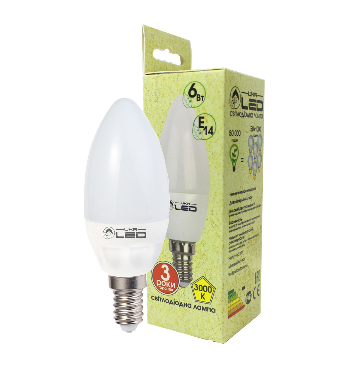 Светодиодная лампочка UKRLED — новинка на рынке LED продукции, которая отличается наивысшим качеством свечения, за надежностью и своей оригинальностью. Мощность лампочки составляет 6 Вт, форма — груша, тип цоколя — Е14, 3000К. Особенностью представленного товара является укороченная высота «юбки», за счет чего увеличивается угол свечения лампы. Стоит отметить также, что корпус изготовлен из ударопрочного пластика и диоды равномерно расположены на алюминиевой матрице. Благодаря этому продлевается их срок службы и лампочки в целом.