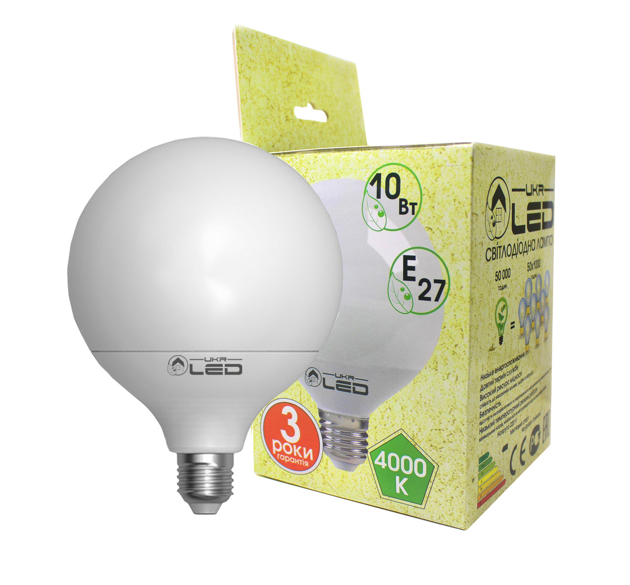 Светодиодная лампочка UKRLED — новинка на рынке LED продукции, которая отличается наивысшим качеством свечения, за надежностью и своей оригинальностью. Мощность лампочки составляет 10 Вт, форма — глобус, тип цоколя — Е27, 4000К. Особенностью представленного товара является укороченная высота «юбки», за счет чего увеличивается угол свечения лампы. Стоит отметить также, что корпус изготовлен из ударопрочного пластика и диоды равномерно расположены на алюминиевой матрице. Благодаря этому продлевается их срок службы и лампочки в целом.