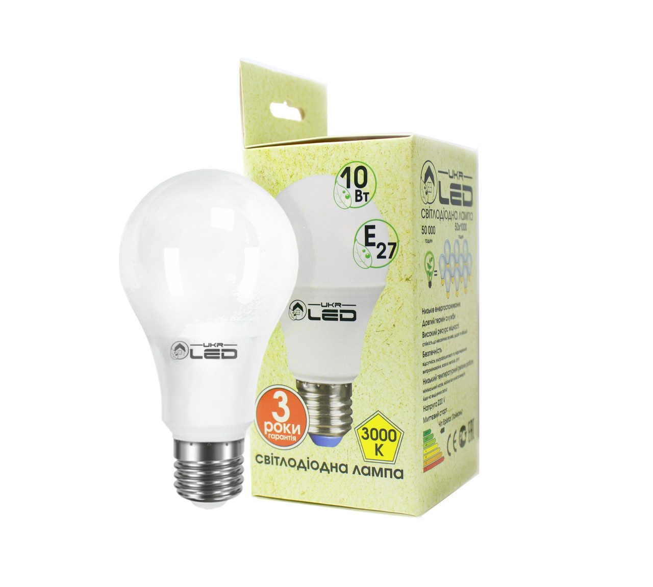 Светодиодная лампочка UKRLED — новинка на рынке LED продукции, которая отличается наивысшим качеством свечения, за надежностью и своей оригинальностью. Мощность лампочки составляет 10 Вт, форма — груша, тип цоколя — Е27, 3000К. Особенностью представленного товара является укороченная высота «юбки», за счет чего увеличивается угол свечения лампы. Стоит отметить также, что корпус изготовлен из ударопрочного пластика и диоды равномерно расположены на алюминиевой матрице. Благодаря этому продлевается их срок службы и лампочки в целом.