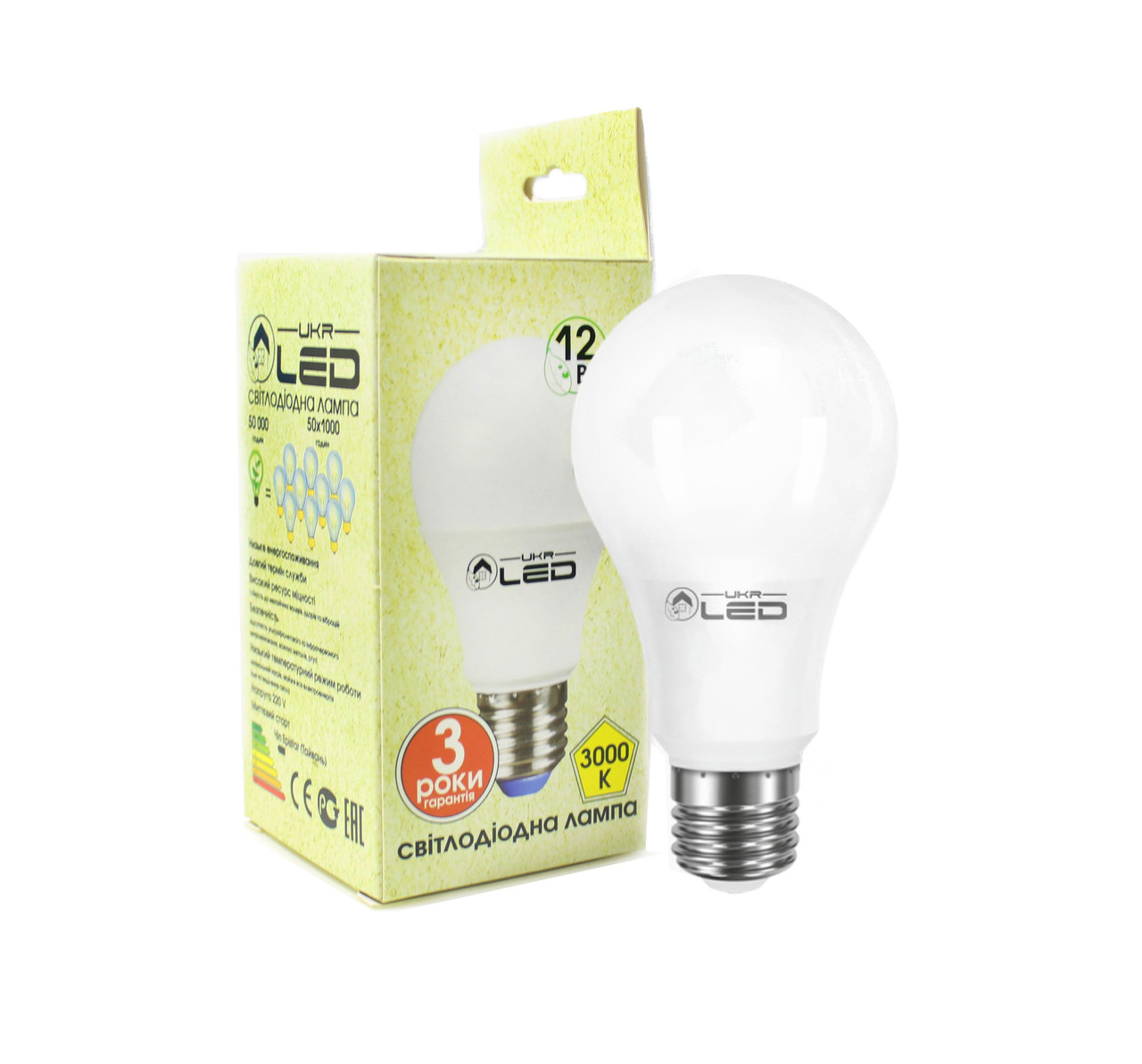 Светодиодная лампочка UKRLED — новинка на рынке LED продукции, которая отличается наивысшим качеством свечения, за надежностью и своей оригинальностью. Мощность лампочки составляет 12Вт, форма — груша, тип цоколя — Е27, 3000К. Особенностью представленного товара является укороченная высота «юбки», за счет чего увеличивается угол свечения лампы. Стоит отметить также, что корпус изготовлен из ударопрочного пластика и диоды равномерно расположены на алюминиевой матрице. Благодаря этому продлевается их срок службы и лампочки в целом.