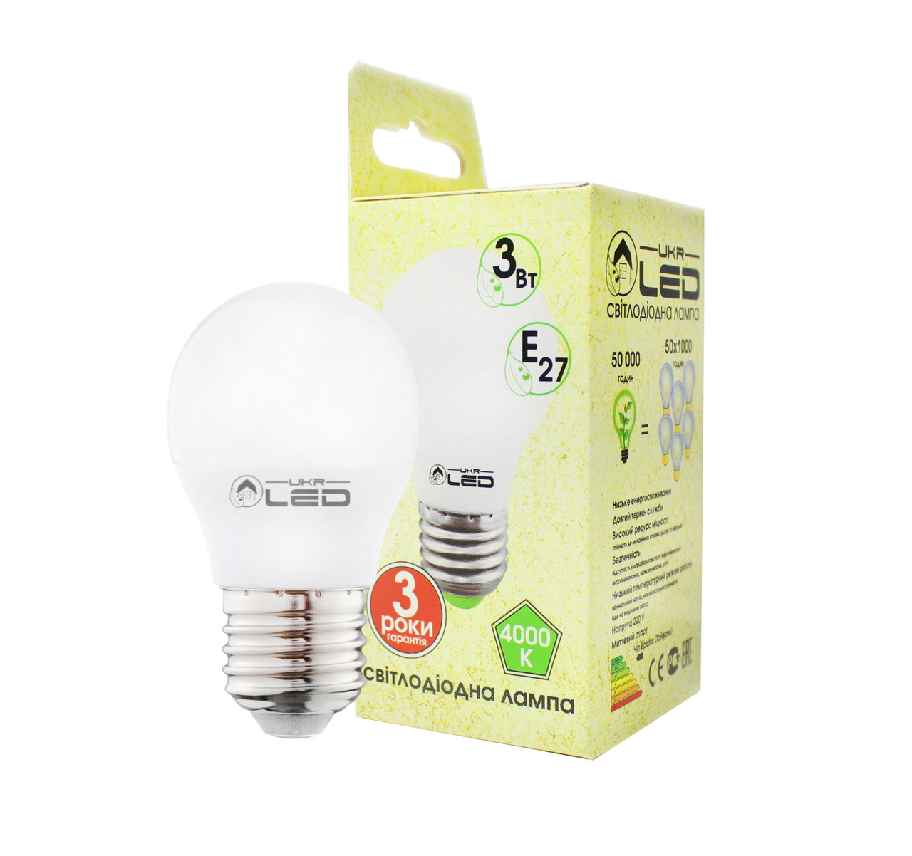 Светодиодная лампочка UKRLED — новинка на рынке LED продукции, которая отличается наивысшим качеством свечения, за надежностью и своей оригинальностью. Мощность лампочки составляет 3 Вт, форма — шарик, тип цоколя — Е27, 4000К. Особенностью представленного товара является укороченная высота «юбки», за счет чего увеличивается угол свечения лампы. Стоит отметить также, что корпус изготовлен из ударопрочного пластика и диоды равномерно расположены на алюминиевой матрице. Благодаря этому продлевается их срок службы и лампочки в целом.