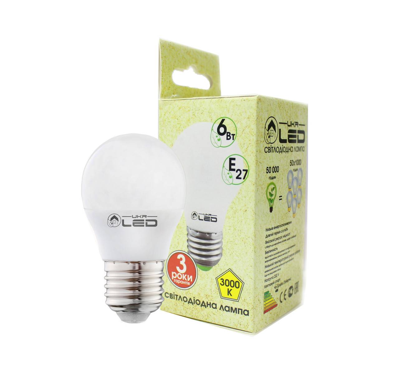 Светодиодная лампочка UKRLED — новинка на рынке LED продукции, которая отличается наивысшим качеством свечения, за надежностью и своей оригинальностью. Мощность лампочки составляет 6 Вт, форма — шарик, тип цоколя — Е27, 3000К. Особенностью представленного товара является укороченная высота «юбки», за счет чего увеличивается угол свечения лампы. Стоит отметить также, что корпус изготовлен из ударопрочного пластика и диоды равномерно расположены на алюминиевой матрице. Благодаря этому продлевается их срок службы и лампочки в целом.