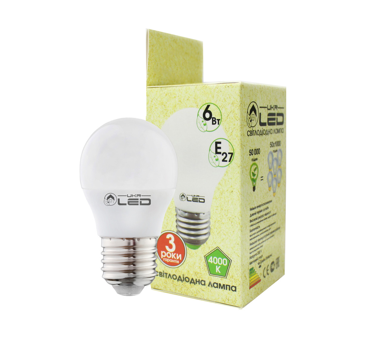 Светодиодная лампочка UKRLED — новинка на рынке LED продукции, которая отличается наивысшим качеством свечения, за надежностью и своей оригинальностью. Мощность лампочки составляет 6 Вт, форма — шарик, тип цоколя — Е27, 4000К. Особенностью представленного товара является укороченная высота «юбки», за счет чего увеличивается угол свечения лампы. Стоит отметить также, что корпус изготовлен из ударопрочного пластика и диоды равномерно расположены на алюминиевой матрице. Благодаря этому продлевается их срок службы и лампочки в целом.