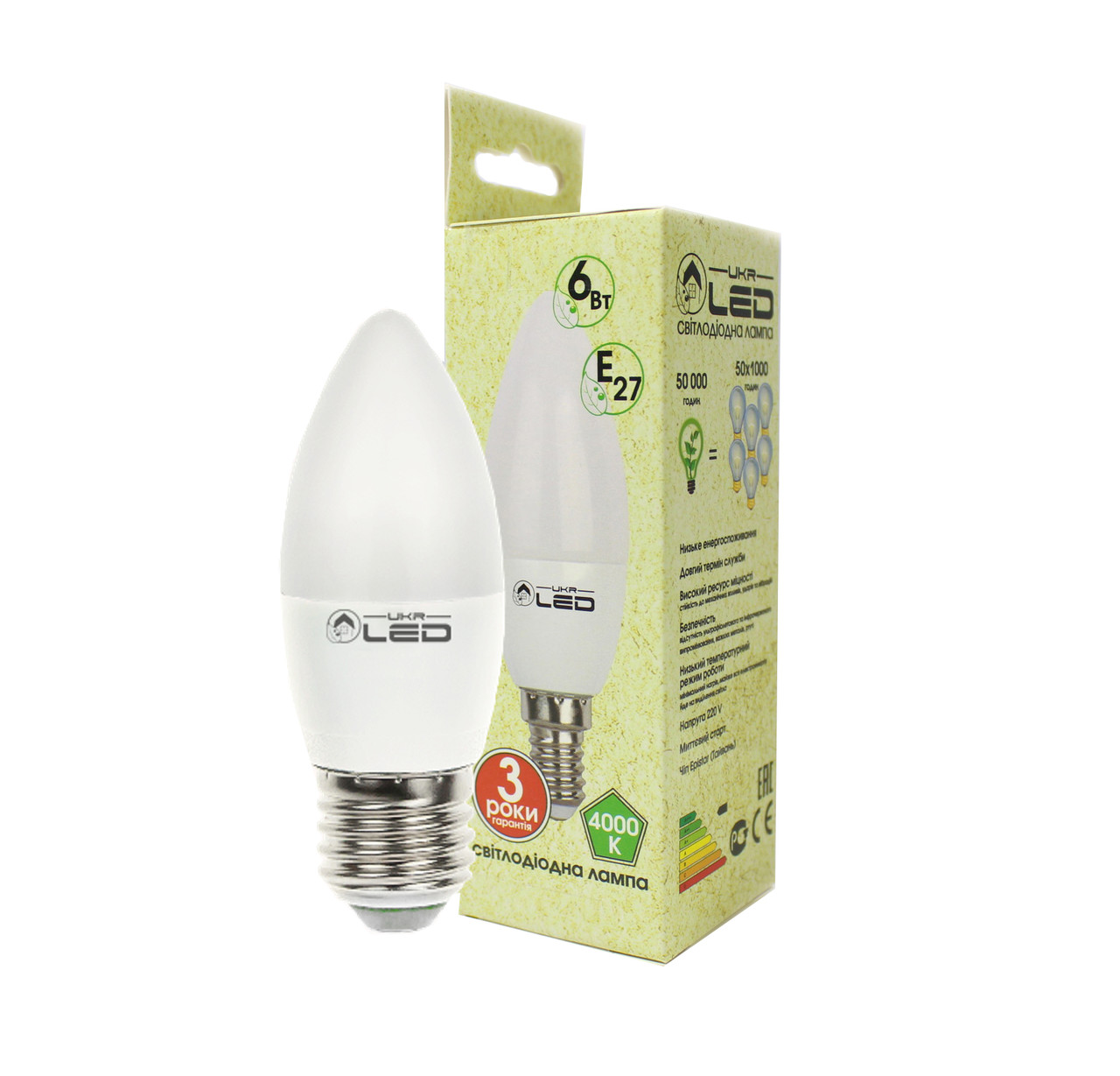 Светодиодная лампочка UKRLED — новинка на рынке LED продукции, которая отличается наивысшим качеством свечения, за надежностью и своей оригинальностью. Мощность лампочки составляет 6 Вт, форма — свеча, тип цоколя — Е27, 4000К. Особенностью представленного товара является укороченная высота «юбки», за счет чего увеличивается угол свечения лампы. Стоит отметить также, что корпус изготовлен из ударопрочного пластика и диоды равномерно расположены на алюминиевой матрице. Благодаря этому продлевается их срок службы и лампочки в целом.